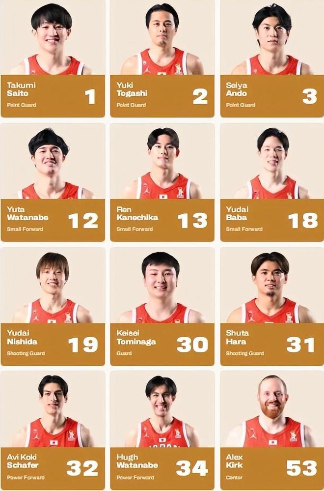 和中国男篮一样,日本男篮方面也公布了这场中日大战的12人大名单,分别是亚历克斯-科克、安藤誓哉、富坚勇树、原修太、渡边雄太、齐藤拓実、马场雄大、幸树、渡边飞勇、西田优大、富永启生、金近廉。从阵容来看,日本男篮也是主力尽出,只不过国内球迷非常熟悉的归化中锋霍金森并没有入选。霍金森的能力还是非常强的,他的落选对中国男篮来说是一个利好。另外科克虽然是一名2米13的中锋,不过他的能力比较一般。这样来看的话,中国男篮内线的优势还是比较明显的。
