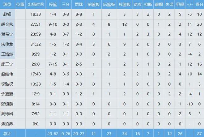 全场比赛,胡金秋首发出战约28分钟,投篮10中9,以几乎100%命中率砍下20分12板(4前场板),完爆日本男篮的归化内线科克,带领中国男篮87-80赢下了至关重要的比赛。