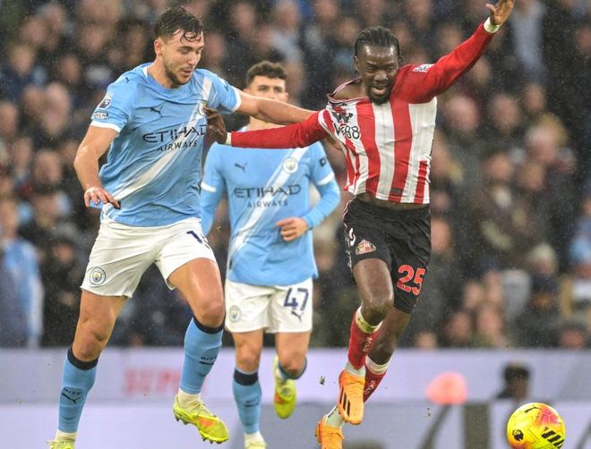 下半场易边再战。第52分钟,多库内切兜射远角,皮球击中立柱弹出。福登随即补射,结果被挡了出去,他感到非常难以置信。2分钟后,曼城差一点丢球。幸好多纳鲁马表现神勇,化解了对手的单刀机会。第59分钟,哈兰德错失良机,他在门前的射门被头球解围。6分钟后,曼城再次进球。谢尔基插花脚传中,福登头球顶进。补时阶段,奥尼安恶劣铲人犯规,被红牌直接罚下。最终,曼城3-0完胜桑德兰。